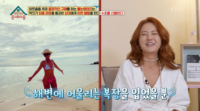 이날 김숙은 “언니 인기 너무 많을 것 같다”, “언니 해변가에서 거의 벗고 있어. 진짜 언니 장난 아니야”라고 이야기했다.
