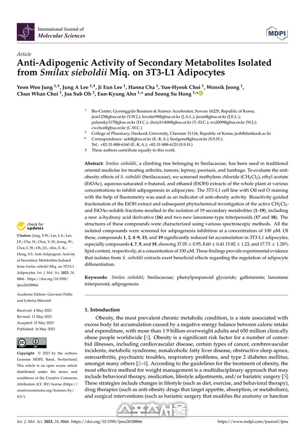〔스포츠서울│수원=좌승훈기자〕경기도경제과학진흥원 바이오산업본부 천연물소재팀과 신약개발지원팀은 낙엽성 덩굴나무인 ‘청가시덩굴’ 추출물과 이차대사산물이 지방 축적 억제 효능이 있음을 발견하고, 지난 5월 국제학술지 ‘International Journal of Molecular Sciences ’ 온라인판에 논문을 게재했다고 15일 밝혔다.