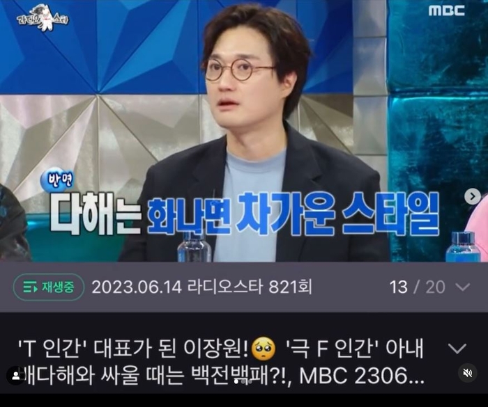 이장원은 “제가 T(이성적)고 다해가 F(감성적)라고 하시는데 싸울 때는 반대다. 저는 다해 말꼬리를 계속 잡는다”라고 밝혔다. 그 말에 MC들은 질색하는 모습을 보였다. 김구라는 “그게 제일 짜증 나는 거야”라고 했다.