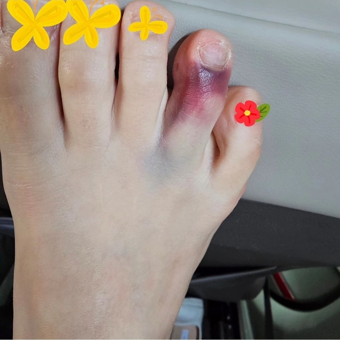 공개한 사진에는 이지현의 네 번째 발가락이 검푸른 멍이 든 것으로 보인다.