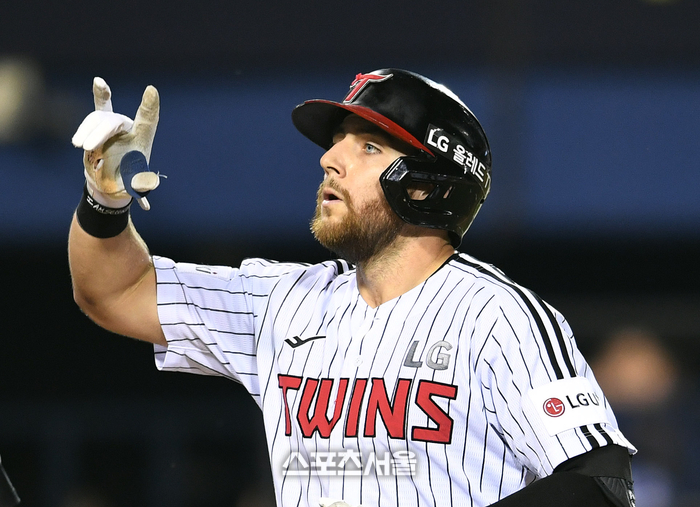 LG 트윈스 오스틴이 15일 잠실구장에서 열린 2023 KBO리그 삼성 라이온즈와 경기 6회말 무사 1루 상황에서 삼성 홍정우를 상대로 동점 2점 홈런을 치고 세리머니를 하고 있다. 오스틴의 시즌 8호 홈런. 2023. 6. 15. 잠실 | 박진업기자 upandup@sportsseoul.com
