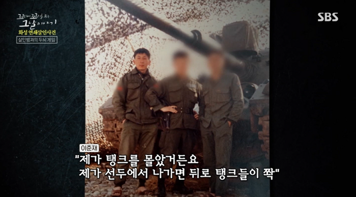 이성준 형사는 “이춘재가 가장 좋아했던 얘기는 ‘군대’로, 탱크 운전사였던 그가 선두에 서서 훈련했던 것이 정말 좋았다며 눈을 반짝였다”고 당시를 회상했다.