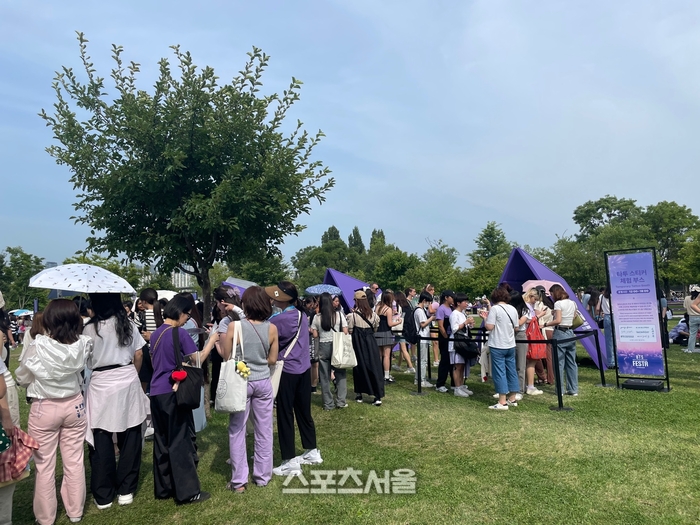 이들은 부채와 손선풍기, 양산을 들고 각종 체험 부스의 긴 줄을 서서 기다리거나 ‘BTS 라이브 스크린’ 앞에 돗자리를 깔고 노래에 맞춰 흥겹게 춤을 추기도 했다. 이날 오후 3시경 여의도 한강공원을 찾아 방탄소년단의 10주년을 축하하고 있는 팬들을 만나봤다.