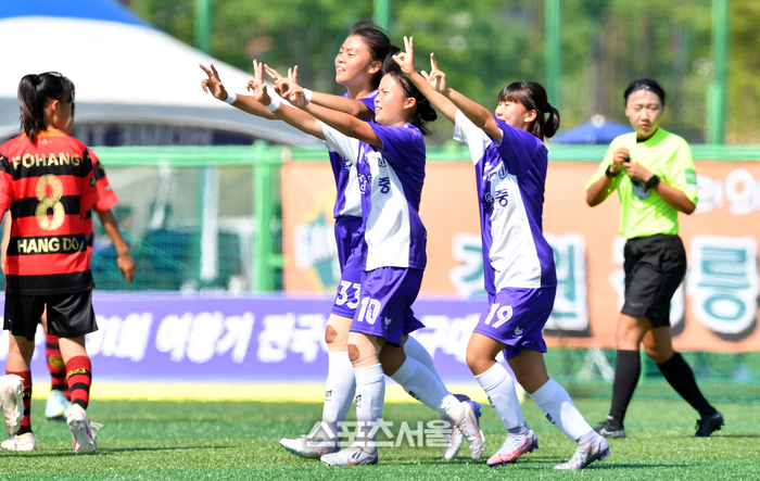 광영중 황다빈이 18일 합천 황강군민체육공원에서 열린 제31회 여왕기 전국여자축구대회 중등부 경북 포항항도중과 전남 광영중의 경기 전반 통열한 슈팅을 성공시킨 후 동료들과 벤치를 향해 하트세리머니를 펼치고 있다.