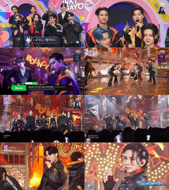 이후 타이틀곡 ‘바운시(BOUNCY) (K-HOT CHILLI PEPPERS)‘ 뮤직비디오 속 모습 그대로 등장한 에이티즈는 역시 믿고 듣는 라이브와 퍼포먼스 실력을 뽐내며 이번 앨범에서 느낄 수 있는 유쾌한 에너지를 전했다.