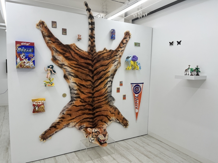 전시장에는 커다란 호랑이 박제를 중심으로 호랑이를 모티브로 한 작품들이 전시돼있다. 호랑이가 모델인 시리얼 패키지부터 애니메이션 캐릭터까지 다양하다.