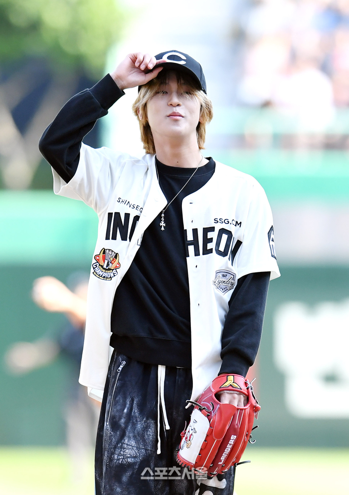 가수 빅나티가 18일 인천 SSG랜더스필드에서 진행된 2023 KBO리그 SSG 랜더스와 롯데 자이언츠의 경기에 앞서 시구를 한 뒤 관중석을 향해 모자를 벗어 인사를 하고 있다. 2023. 6. 18. 문학 | 박진업기자 upandup@sportsseoul.com