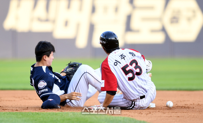 LG 이주형이 18일 잠실야구장에서 열린 2023 KBO리그 두산과 경기 6회말 2사 우중간 2루타를 친 후 2루에서 세이프되고 있다. 상대 2루수는 박계범. 2023. 6. 18. 잠실 | 최승섭기자 thunder@sportsseoul.com