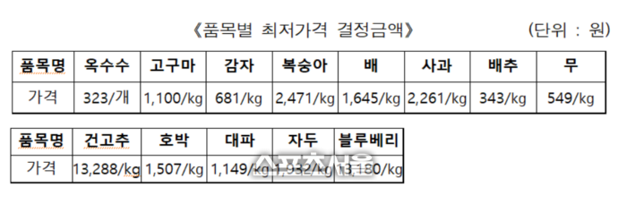 주요 농산물은 옥수수, 고구마, 감자, 복숭아, 배, 사과, 배추, 무, 건고추, 호박, 대파, 자두, 블루베리 등 13개 품목으로 결정됐다. 품목별 최저가격은 아래와 같다.