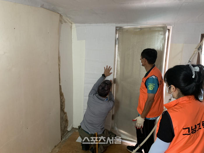 이날 주거환경개선으로 집안 내부의 도배를 위한 물품이동 및 도배작업, 전기시설 보강작업, 장판교체, 주방 및 욕실 청소 및 물품정리, 책꽂이 및 수납공간 정리정돈 등으로 뙤약볕 날씨에 구슬땀을 흘렸다.