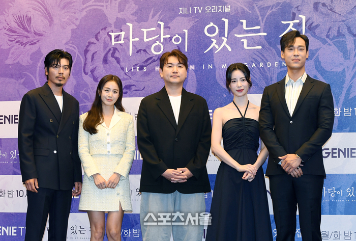 19일 서울 마포구 스탠포드호텔에서 열린 지니 TV 오리지널 드라마 '마당이 있는 집' 제작발표회에서 출연 배우들이 취재진을 향해 포즈를 취하고 있다. 왼쪽부터 배우 김성오, 김태희, 정지현 감독, 배우 임지연, 최재림. 동명의 베스트셀러 소설을 원작으로 한 '마당이 있는 집'은 뒷마당에서 나는 수상한 냄새로 인해 완전히 다른 삶을 살던 두 여자가 만나 벌어지는 서스펜스 스릴러로 김태희, 임지연, 김성오, 최재림 등이 출연한다. 2023. 6. 19. 박진업기자 upandup@sportsseul.com