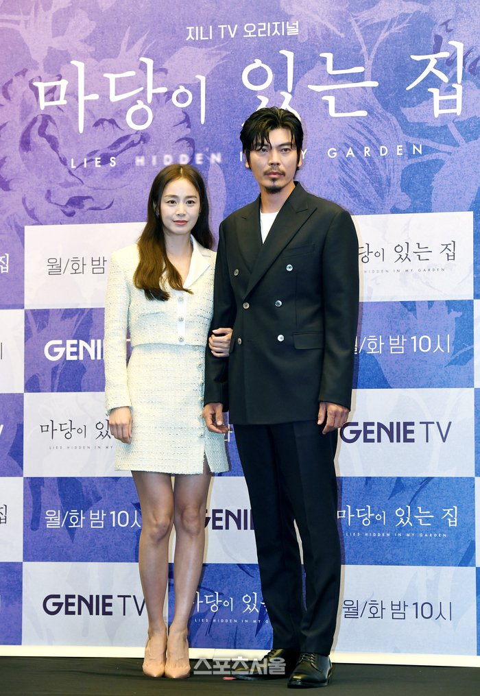 배우 김태희(왼쪽)와 김성오가 19일 서울 마포구 스탠포드호텔에서 열린 지니 TV 오리지널 드라마 '마당이 있는 집' 제작발표회에서 취재진을 향해 포즈를 취하고 있다. 동명의 베스트셀러 소설을 원작으로 한 '마당이 있는 집'은 뒷마당에서 나는 수상한 냄새로 인해 완전히 다른 삶을 살던 두 여자가 만나 벌어지는 서스펜스 스릴러로 김태희, 임지연, 김성오, 최재림 등이 출연한다. 2023. 6. 19. 박진업기자 upandup@sportsseul.com