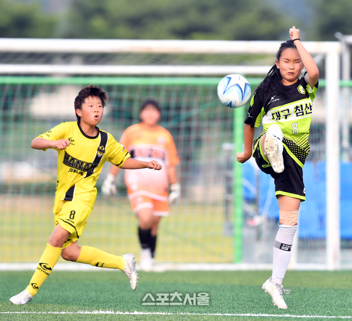 침산초 권시연이 19일 합천 황강군민체육공원에서 열린 제31회 여왕기 전국여자축구대회 8강전 광주하남중앙초와 대구침산초의 경기에서 볼을 걷어내고 있다. 2023.06.19.