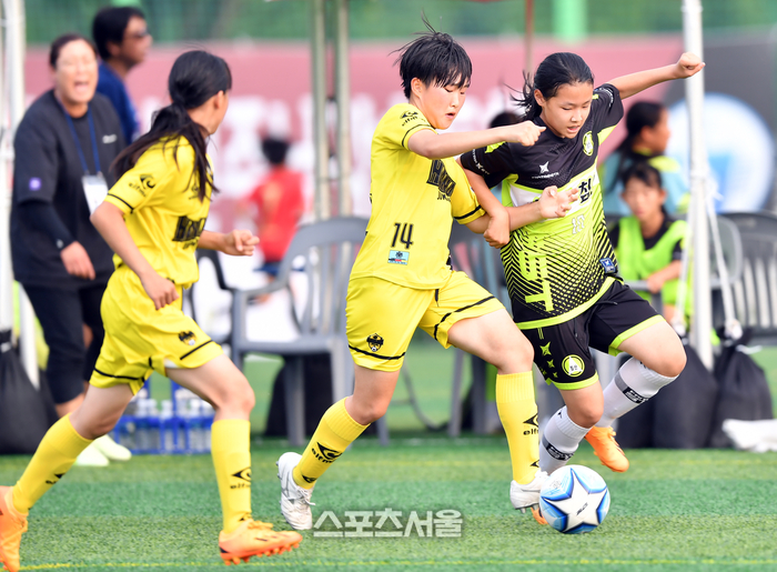 침산초 유아림이 19일 합천 황강군민체육공원에서 열린 제31회 여왕기 전국여자축구대회 8강전 광주하남중앙초와 대구침산초의 경기에서 김유라 마크를 받으며 돌파를 시도하고 있다. 2023.06.19.