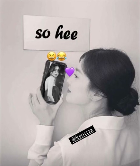 공개된 사진에는 송혜교가 휴대전화를 손에 들고 인증샷을 남기고 있는 모습이 담겨있었다. 전화기 배경화면에 한소희의 사진이 담겨있어 시선을 모았다. 그런데 이는 한소희가 해당 사진에 자신의 얼굴을 합성한 것이였다. 더불어 한소희는 하트 이모티콘까지 덧붙이며 송혜교를 향한 일편단심 애정을 드러내 웃음을 안겼다.