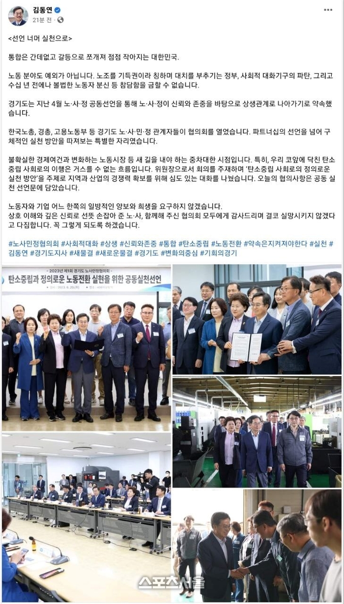 〔스포츠서울│수원=좌승훈기자〕김동연 경기도지사는 20일 자신의 SNS에 ‘선언 너머 실천으로’란 제목의 글을 통해 “통합은 간데없고 갈등으로 쪼개져 점점 작아지는 대한민국. 노동 분야도 예외가 아니다”고 했다.