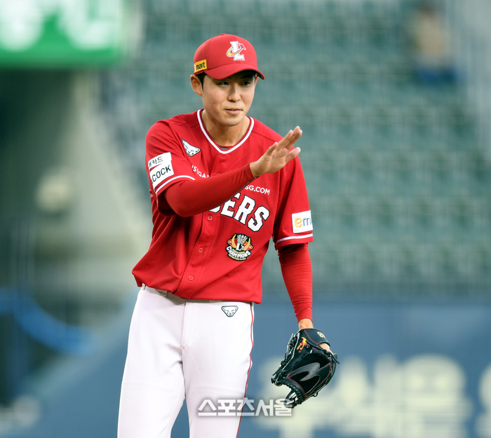 SSG 선발투수 조성훈이 20일 잠실야구장에서 열린 2023 KBO리그 두산과 경기 2회말 투구에 맞은 상대 김대한에 사과하고 있다. 2023. 6. 20. 잠실 | 최승섭기자 thunder@sportsseoul.com