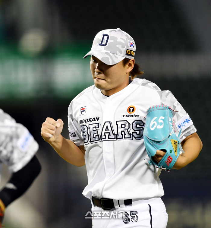 두산 투수 정철원이 20일 잠실야구장에서 열린 2023 KBO리그 SSG와 경기 7회초 1사1루 상대 추신수를 병살로 처리한 후 환호하고 있다. 2023. 6. 20. 잠실 | 최승섭기자 thunder@sportsseoul.com