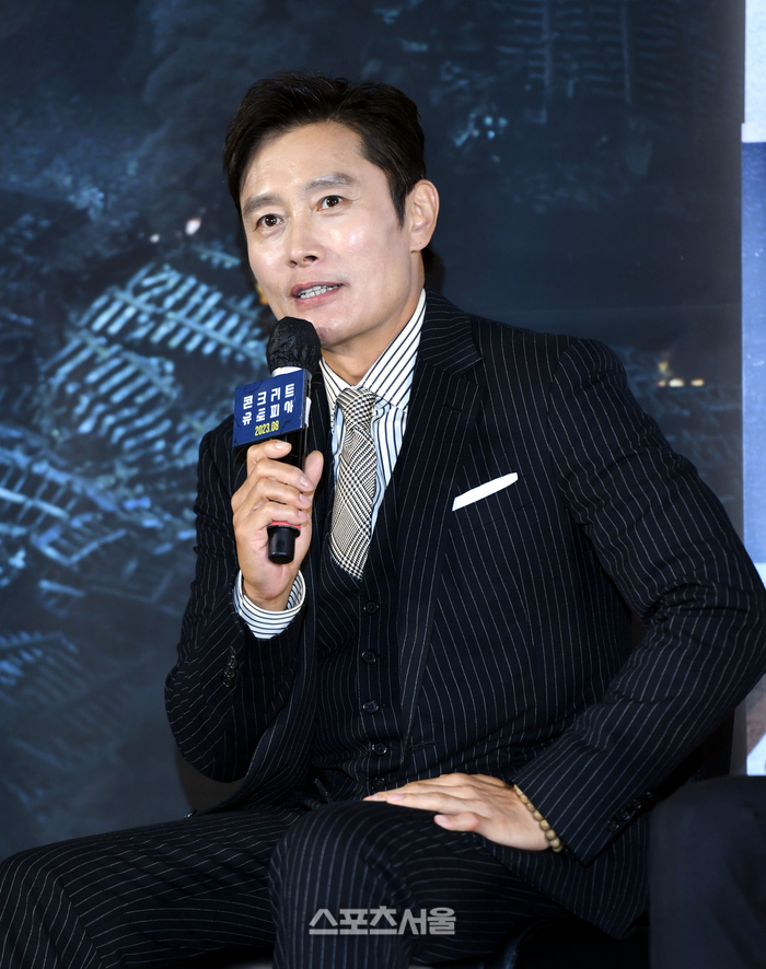 이병헌이 21일 서울 롯데시네마 건대입구에서 열린 영화 '콘크리트 유토피아' 제작보고회에서 인사를 하고 있다. '콘크리트 유토피아' 는 대지진으로 폐허가 되어 버린 서울, 유일하게 남은 황궁 아파트로 생존자들이 모여들며 시작되는 이야기를 그린 재난 드라마다. 2023. 6. 21. 최승섭기자 thunder@sportsseoul.com