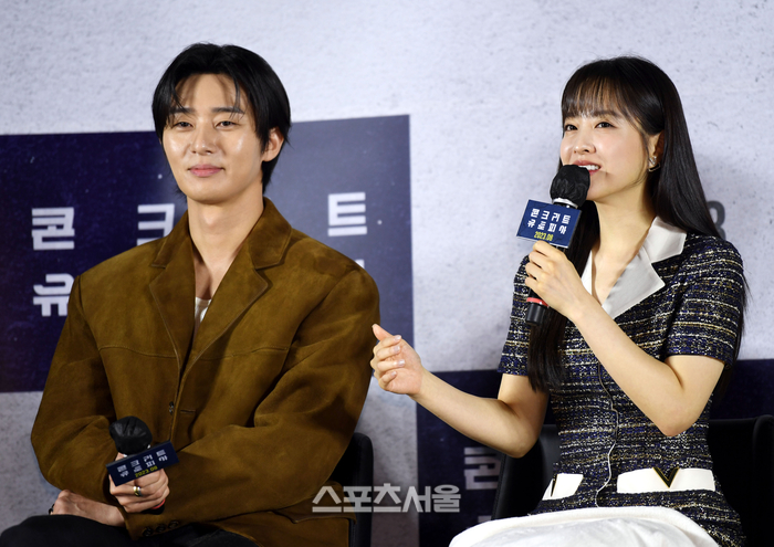 박보영이 21일 서울 롯데시네마 건대입구에서 열린 영화 '콘크리트 유토피아' 제작보고회에서 사회자의 질문에 답하고 있다. '콘크리트 유토피아' 는 대지진으로 폐허가 되어 버린 서울, 유일하게 남은 황궁 아파트로 생존자들이 모여들며 시작되는 이야기를 그린 재난 드라마다. 2023. 6. 21. 최승섭기자 thunder@sportsseoul.com