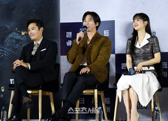 박서준(가운데)이 21일 서울 롯데시네마 건대입구에서 열린 영화 '콘크리트 유토피아' 제작보고회에서 사회자의 질문에 답하고 있다. '콘크리트 유토피아' 는 대지진으로 폐허가 되어 버린 서울, 유일하게 남은 황궁 아파트로 생존자들이 모여들며 시작되는 이야기를 그린 재난 드라마다. 2023. 6. 21. 최승섭기자 thunder@sportsseoul.com