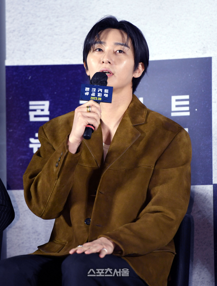 박서준은 “‘콘크리트 유토피아’는 나한테 먼저 제안이 온 작품이 아니다. 하지만 이병헌 선배님과 꼭 함께 작업하고 싶은 마음에 내가 먼저 출연하고 싶다고 강하게 어필했다”고 고백했다.