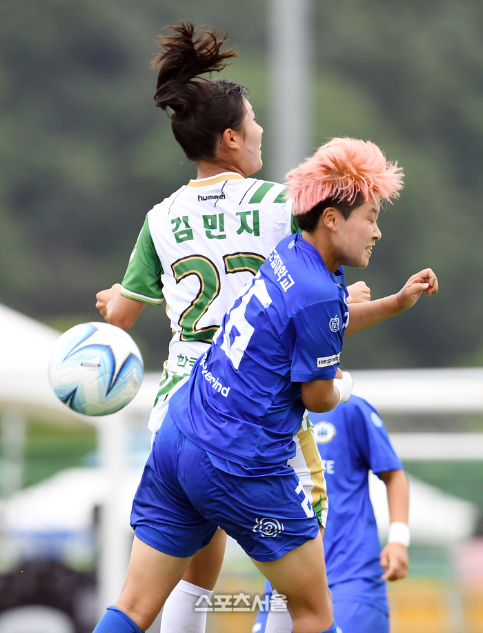 강원도립대 이수민(오른쪽)이 21일 경남 합천 황강군민체육공원에서 열린 제31회 여왕기 전국여자축구대회 대학부 경북 위덕대와 경기에서 위덕대 김민지와 공중볼을 다투고 있다. 2023.06.21. 합천 | 박진업기자 upandup@sportsseoul.com