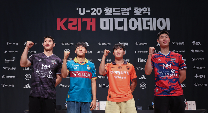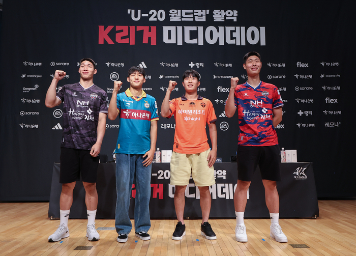 [스포츠서울|배우근기자] 20세 이하(U-20) 월드컵 4강 신화의 주역 4총사가 K리그 재개를 앞두고 뭉쳤다. 김준홍 이영준(이상 김천) 배준호(대전) 이승원(강원)이 21일 서울 종로구 아산정책연구원에서 열린 ‘U-20 월드컵 활약 K리거 미디어데이’에 참석해 소회를 풀어냈다. 소속팀 유니폼을 입고 취재진을 마주했다. 월드컵 당시의 이야기와 서로에 대한 평가, 가깝게는 K리그에서 기대, 멀게는 해외무대에 대한 꿈까지 또박또박 밝혔다.