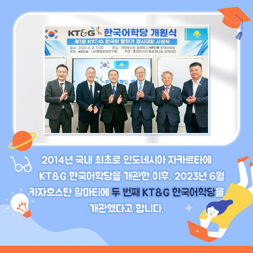 경제 | 기업 [카드뉴스] 카자흐스탄 두 번째 한국어학당 개관, 글로벌 인재 육성 나서는 KT&G 입력2023-06-22 11:38:54 북마크 페이스북 트위터 SNS 더보기 가글자크기설정 인쇄 SNS 더보기 닫기 네이버밴드 네이버블로그 URL복사 글자크기 설정 메뉴 닫기 글자크기 설정 시 다른 기사의 본문도동일하게 적용됩니다. 가 가 가 가 가 [스포츠서울 | 신재유기자]whyjay@sportsseoul.com 기사추천 0