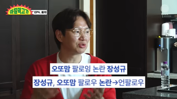 장성규가 “구설수가 많다. ‘오또맘’ 아냐. 내가 SNS 팔로우를 했다고 기사가 났다. 내가 유부남인데 ‘되게 가정적인 척하면서 계정을 보고 있다’라고 된 거다”며 “난 그냥 (그분이) 인플루언서고 그냥 맞팔하자 해서 한 거다”고 해명했다.