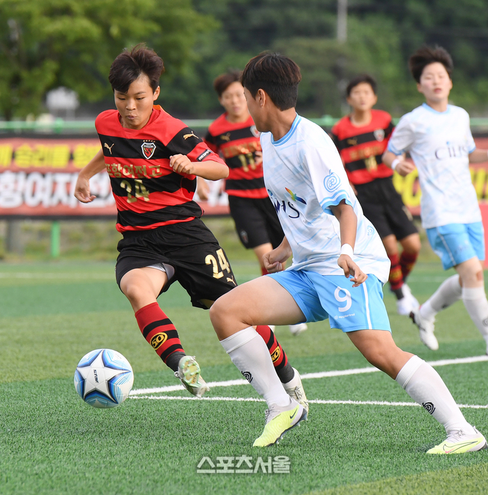 포항여전고 이민서(왼쪽)가 22일 경남 합천 황강군민체육공원에서 열린 '웰니스 힐링명품도시 합천에서 펼쳐지는 제31회 여왕기 전국여자축구대회' 고등부 충남 인터넷고와 8강 경기에서 인터넷고 배단영의 공을 가로채고 있다. 2023.06.22. 합천 | 박진업기자 upandup@sportsseoul.com
