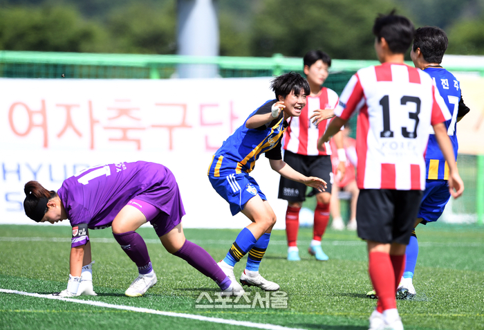 울산과학대 윤민지(가운데)가 23일 경남 합천 황강군민체육공원에서 열린 '웰니스 힐링명품도시 합천에서 펼쳐지는 제31회 여왕기 전국여자축구대회' 대학부 고려대와 4강 경기에서 선제골을 넣은 뒤 기뻐하고 있다. 2023.06.23. 합천 | 박진업기자 upandup@sportsseoul.com