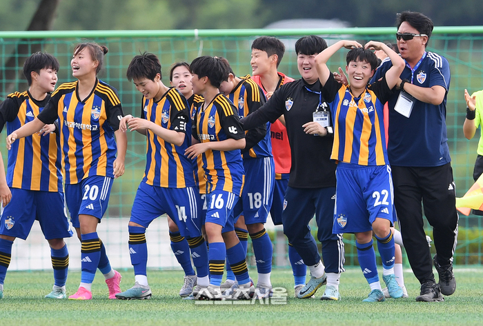 울산과학대 박수정(오른쪽 둘째)이 23일 경남 합천 황강군민체육공원에서 열린 '웰니스 힐링명품도시 합천에서 펼쳐지는 제31회 여왕기 전국여자축구대회' 대학부 고려대와 4강 경기에서 결승골을 넣은 뒤 강성민 감독(맨 오른쪽)과 함께 기뻐하고 있다. 울산과학대는 고려대를 3-2로 꺾고 결승에 진출했다. 2023.06.23. 합천 | 박진업기자 upandup@sportsseoul.com