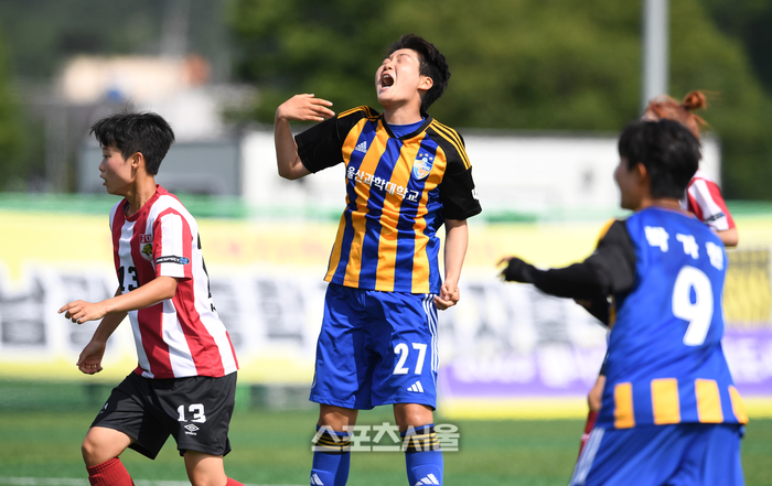 울산과학대 이진주(가운데)가 23일 경남 합천 황강군민체육공원에서 열린 '웰니스 힐링명품도시 합천에서 펼쳐지는 제31회 여왕기 전국여자축구대회' 대학부 고려대와 4강 경기에서 슛이 골로 이어지지 않자 아쉬워하고 있다. 2023.06.23. 합천 | 박진업기자 upandup@sportsseoul.com