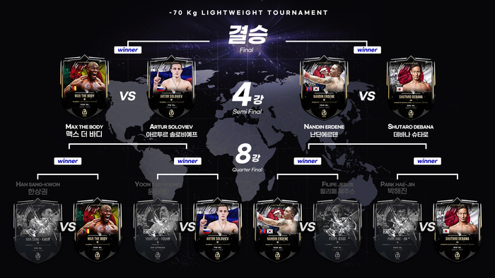 라이트급 4강전은 대한민국의 난딘에르덴(36·남양주 팀피니쉬)과 일본의 데바나 슈타로(38·코브라카이)의 대결, 카메룬의 맥스 더 바디(39·브레이브짐)와 러시아의 아르투르 솔로비예프(29·MFP)의 대결로 확정됐다.