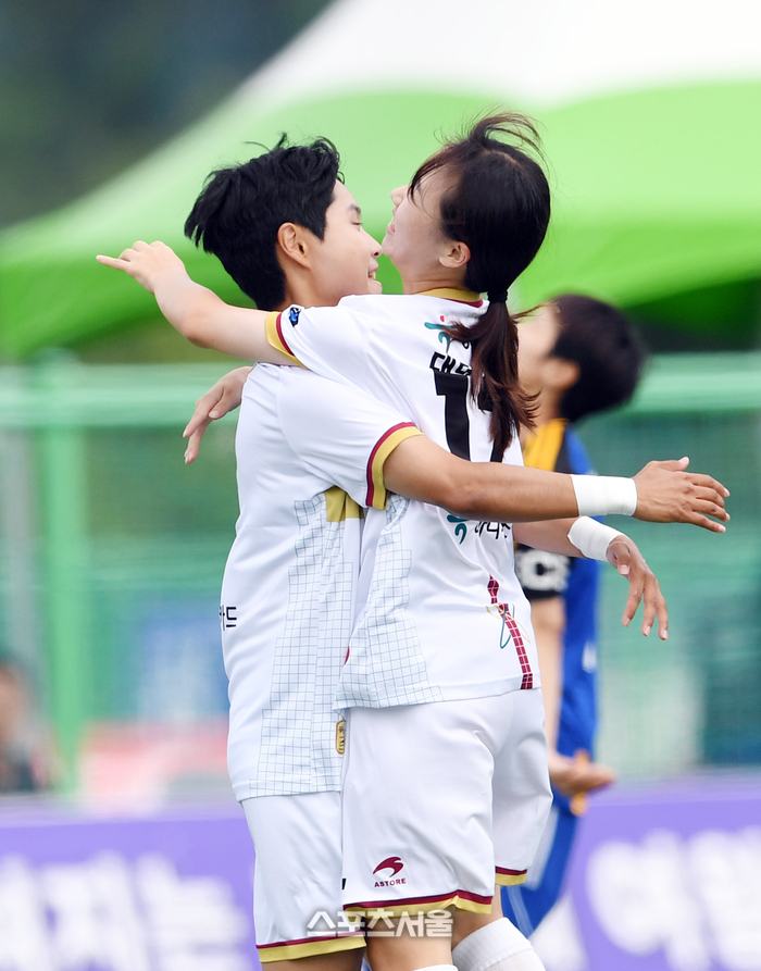 대전 대덕대 신혜빈(왼쪽)이 25일 경남 합천 황강군민체육공원에서 열린 '웰니스 힐링명품도시 합천에서 펼쳐지는 제31회 여왕기 전국여자축구대회' 대학부 울산과학대와 결승전에서 선제골을 넣고 윤유리와 기뻐하고 있다. 2023.06.25. 합천 | 박진업기자 upandup@sportsseoul.com