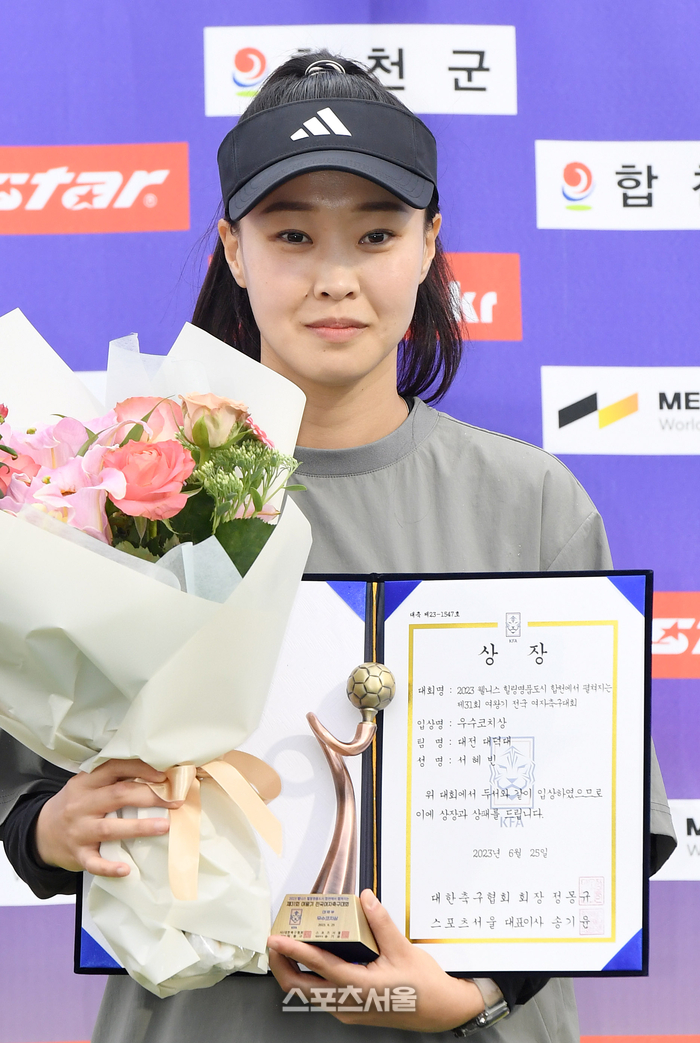 대전 대덕대 서혜빈 코치가 25일 경남 합천 황강군민체육공원에서 열린 '웰니스 힐링명품도시 합천에서 펼쳐지는 제31회 여왕기 전국여자축구대회' 대학부 시상식에서 우수코치상을 받은 뒤 기념촬영을 하고 있다. 2023.06.25. 합천 | 박진업기자 upandup@sportsseoul.com