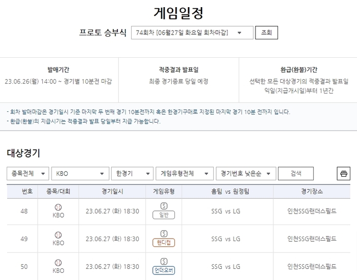 국민체육진흥공단이 발행하는 체육진흥투표권 스포츠토토의 수탁사업자 스포츠토토코리아가 오는 27일 인천SSG랜더스필드에서 열리는 SSG랜더스(홈)-LG트윈스(원정)전을 대상으로 하는 프로토 승부식 74회차 한경기구매 게임을 26일 오후 2시부터 발매한다고 밝혔다.