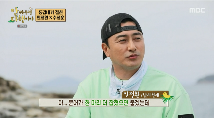 안정환은 “그래도 나는 문어를 낚겠다”라며 문어 낚시를 고집했다. 하지만 소득이 없자 안정환도 생선 낚시로 변경해 웃음을 자아냈다.
