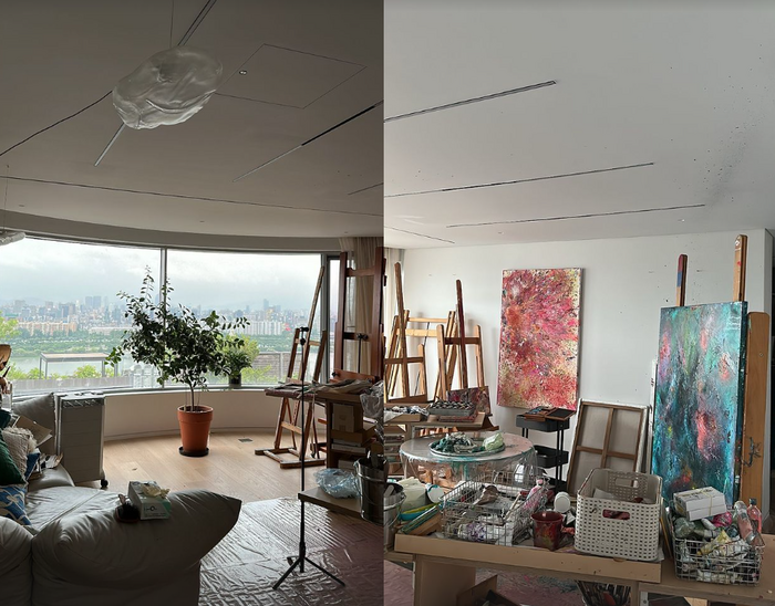 사진 속에는 이혜영이 그림을 그리는 공간이 담겼다. 어마어마한 크기의 작업실은 통창 너머로 아름다운 뷰가 눈길을 끈다. 이젤과 캔버스, 각종 미술 도구가 놓인 공간에는 이혜영의 작품도 놓여있다.