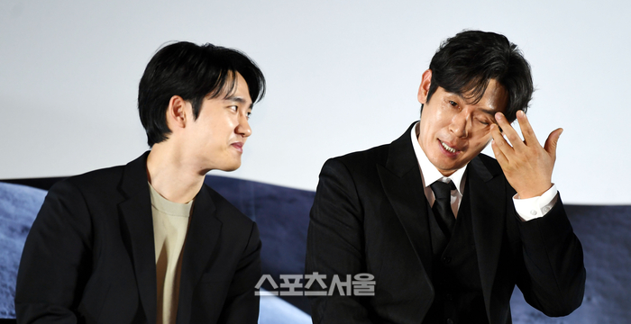 설경구가 27일 서울 CGV 용산아이파크몰에서 열린 영화 '더문' 제작보고회에서 사회자의 도경수와의 투샷 요청에 웃고 있다. '더 문'은 달에 홀로 남겨져 고립된 우주 대원과 지구에서 어떻게든 그를 생환하려는 동료의 사투를 그린 영화로 오는 8월 2일 개봉 예정이다. 2023. 6. 27. 최승섭기자 thunder@sportsseoul.com
