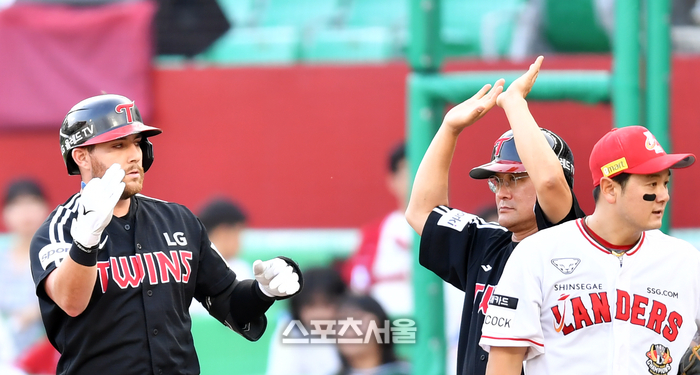 LG 4번타자 오스틴이 27일 인천SSG랜더스필드에서 열린 2023 프로야구 SSG랜더스와 LG트윈스의 경기 1회초 2사 2루 1타점 안타로 출루하고 있다. 하이파이브 준비하는 이종범. 2023.06.27.
