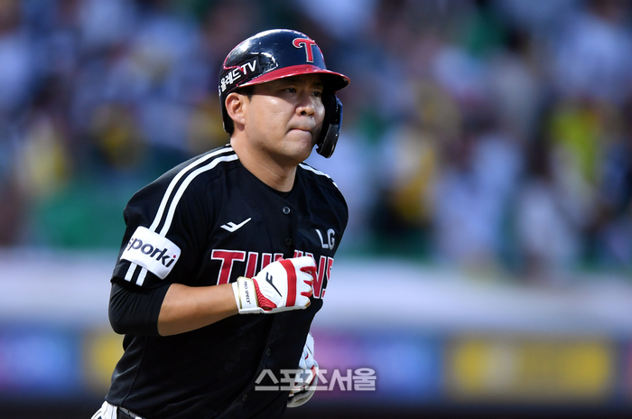 LG 9번타자 김민성이 27일 인천SSG랜더스필드에서 열린 2023 프로야구 SSG랜더스와 LG트윈스의 경기 5회초 선두타자로 나와 솔로홈런을 터트린 후 홈인하고 있다. 2023.06.27.