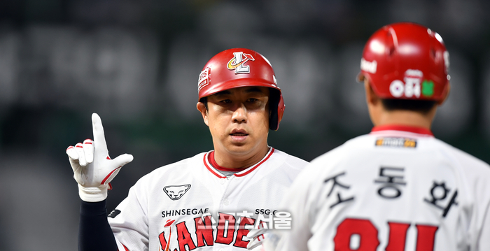 SSG 1번타자 김강민이 27일 인천SSG랜더스필드에서 열린 2023 프로야구 SSG랜더스와 LG트윈스의 경기 8회말 선두타자로 나와 안타로 출루하고 있다. 2023.06.27.