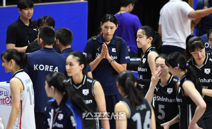 한국 여자배구 대표팀의 김연경 어드바이저(가운데 위)가 27일 서수원칠보체육관에서 열린 2023 수원 발리볼네이션스리그 불가리아와 경기에서 세트 스코어 1-3으로 패한 뒤 후배 선수들에게 박수를 보내고 있다. 2023. 6. 27. 수원 | 박진업기자 upandup@sportsseoul.com