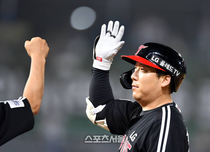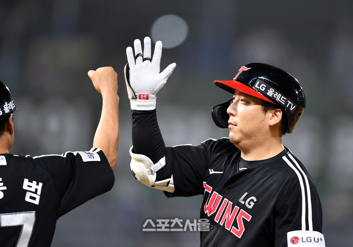 LG 3번타자 김현수가 28일 인천SSG랜더스필드에서 열린 2023 프로야구 SSG랜더스와 LG트윈스의 경기 8회초 1사 3루에서 역전안타를 터트린 후 자축하고 있다.2023.06.28.