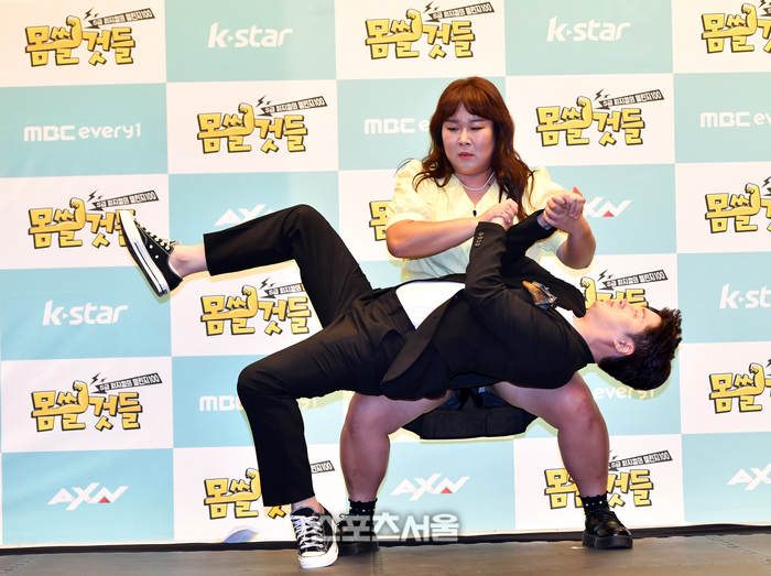 김민경과 남호연이 29일 상암동 스탠포드호텔에서 열린 MBC 에브리원 새 예능 ‘몸쓸것들:S급 피지컬의 챌린지 100’ 제작발표회 무대에 올라 팀별 챌린지를 하고 있다.
