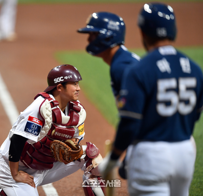 키움 포수 이지영이 4일 고척스카이돔에서 열린 2023 프로야구 키움히어로즈와 NC다이노스 경기 1회초 1사 1,3루 권희동 중견수 플라이때 3루주주 서호철이 홈 언더베이스를 시도해 세이프되자 아쉬워하고 있다. 중견수 이정후의 송구가 높아 타이밍상 유리했지만 실점했다. 2023.07.04.