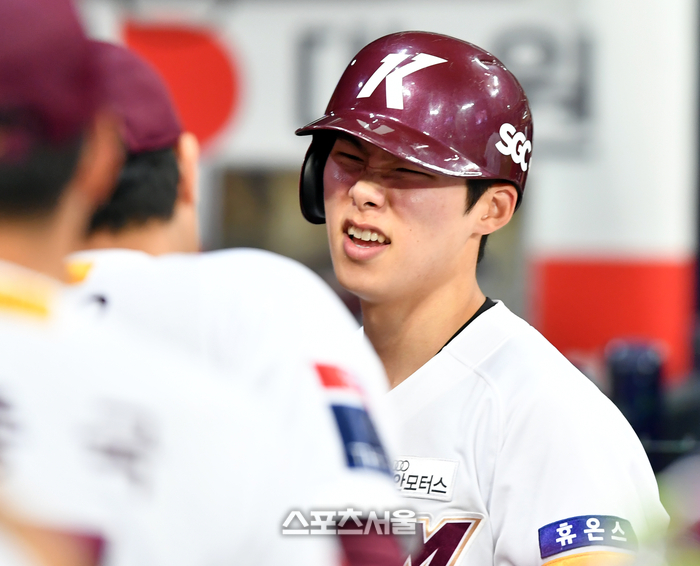 키움 2번타자 김혜성이 4일 고척스카이돔에서 열린 2023 프로야구 키움히어로즈와 NC다이노스 경기 5회말 2사 2루에서 2루타로 출루하며 4년연속 100안타를 달성한 후 이정후의 안타때 득점하고 있다. 2023.07.04.