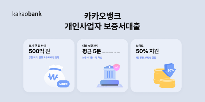 [스포츠서울 | 홍성효기자] 카카오뱅크가 지난 5월25일 출시한 개인사업자 보증서대출 상품 공급액이 출시 한 달 만에 500억원을 넘어섰다고 5일 밝혔다.